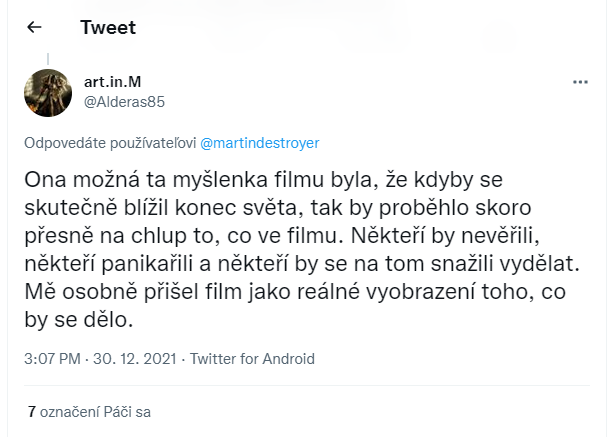 Vo filme si človek dokáže ľahko spojiť narážky na skutočné osoby a ak sa mu zdá vývoj príbehu prehnaný, presne to bol zámer. Napriek tomu, že Don’t Look Up vyšiel v čase pandémie, apeluje hlavne na klimatickú krízu. Veľa známych hercov prijalo svoju rolu aj preto, aby mala dráma dosah na čo najviac ľudí. Bolo by však pritiahnuté za vlasy tvrdiť, že po dvoch hodinách pozerania sa polovica sveta zmobilizuje a zachráni planétu pred katastrofou. Ak sa tak ale nestane, musíme rátať s tým, že by k filmu pribudol popis „podľa skutočných udalostí“.