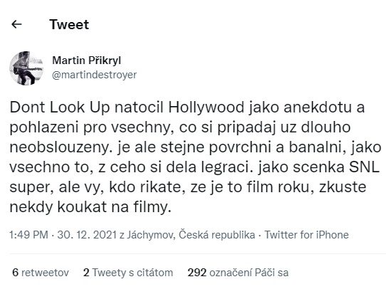 Netflix každoročne prichádza s filmovými titulmi, ktoré sú na prvých priečkach v sledovanosti a virálnosti. Don’t Look Up prináša príbeh o gigantickej kométe rútiacej sa na našu Zem. Hlavných aj vedľajších úloh sa zhostili tie najväčšie hollywoodske esá (Leonadro DiCaprio, Jennifer Lawrence, Meryl Streep), preto film prirodzene vyvolal rozruch od zverejnenia prvého traileru, ktorý vyšiel v januári 2021. Dnes je to len pár dní, čo mali diváci možnosť vychutnať si satirický pohľad na koniec sveta od režiséra a scenáristu Adama Mckaya.