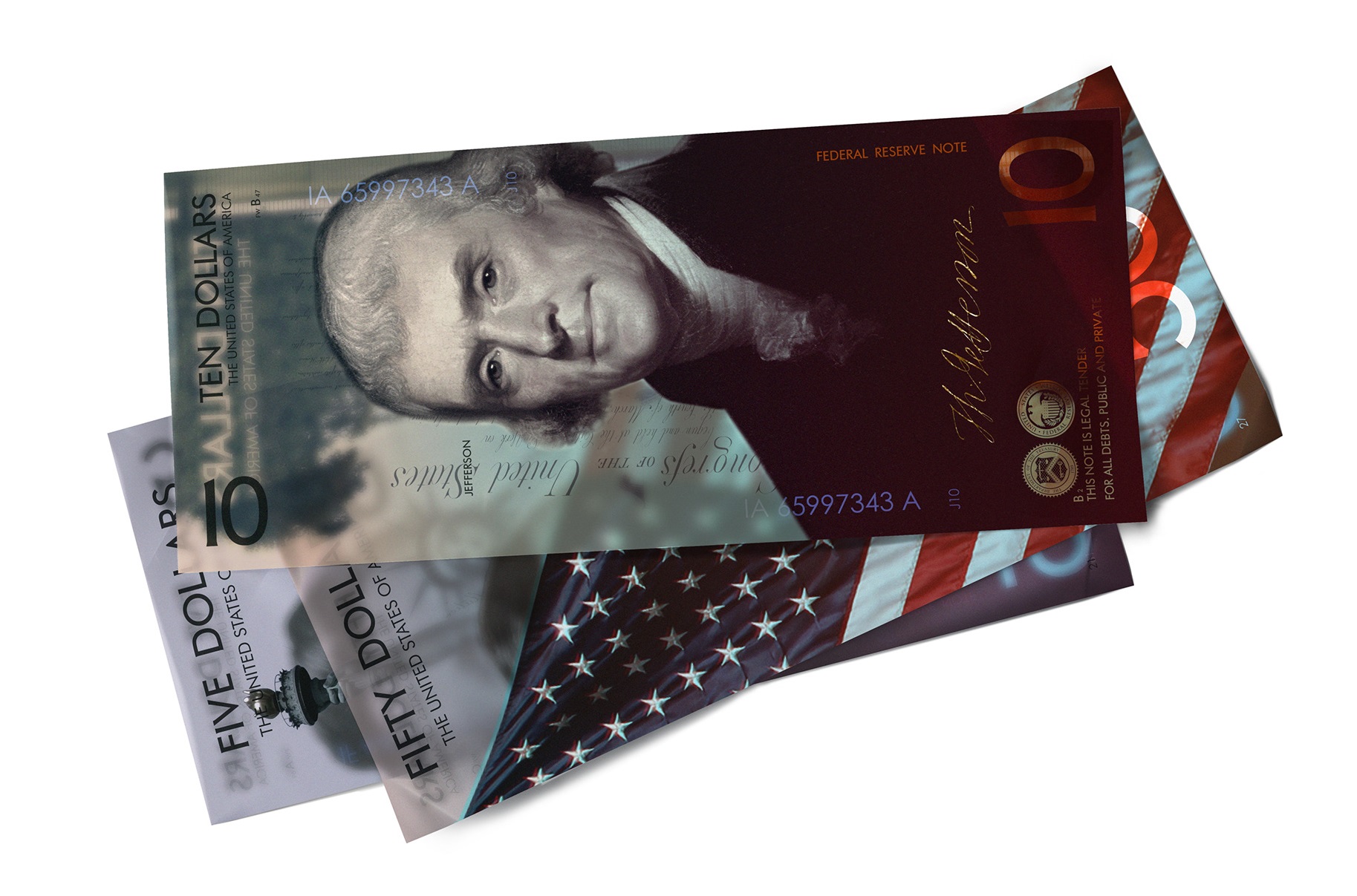 Bieloruský dizajnér Andrey Avgust vytvoril redizajn dolárových bankoviek používaných v Spojených štátoch amerických, pričom namiesto konvenčnej zelenej, bielej a šedej farebnej schémy využil plnofarebnú grafiku s vysokým rozlíšením a čiastočne vertikálnu orientáciu obsahu. Výsledkom sú nové dolárové bankovky s nominálnymi hodnotami 1,5, 10, 20, 50 a 100 amerických dolárov.